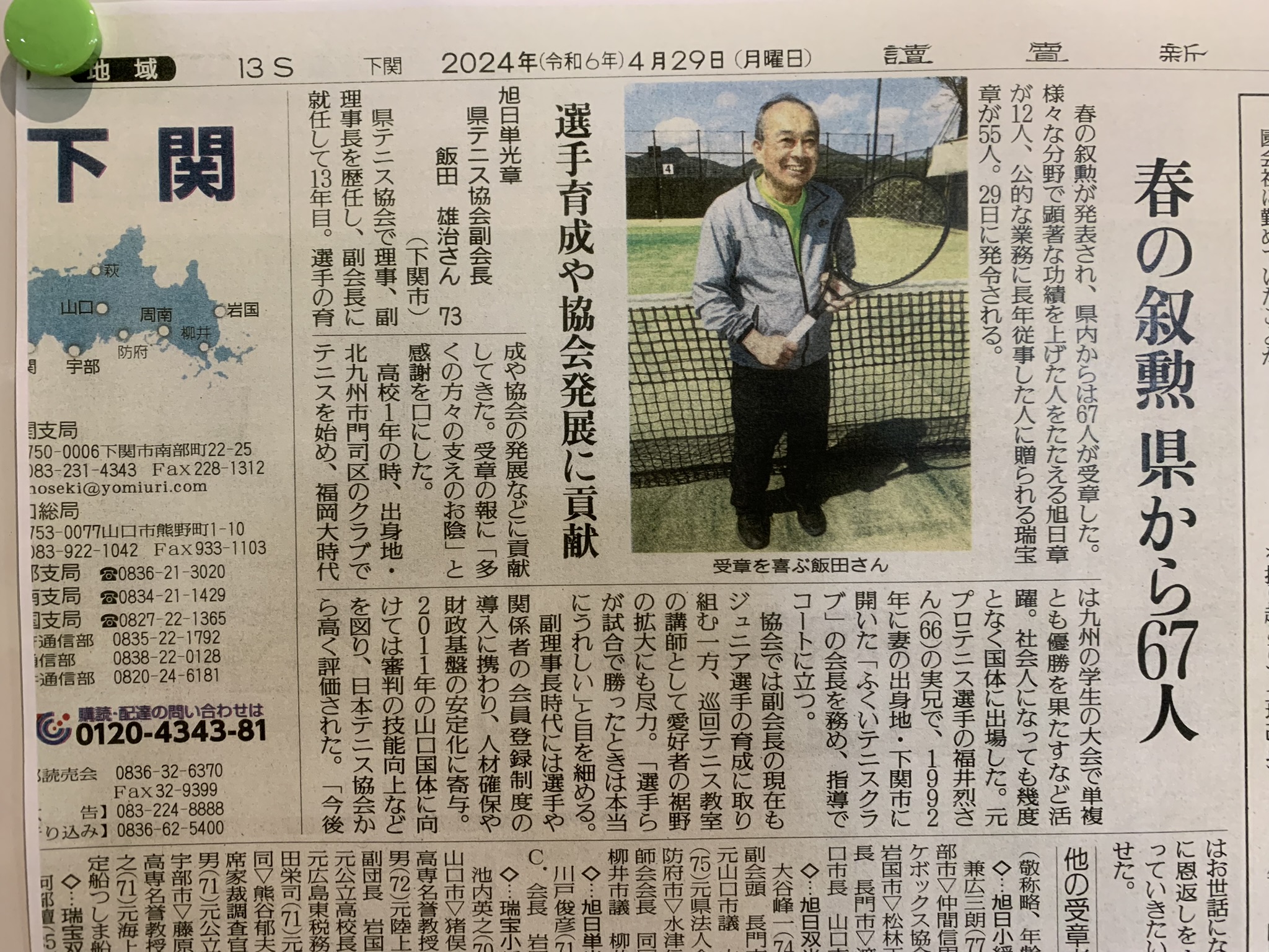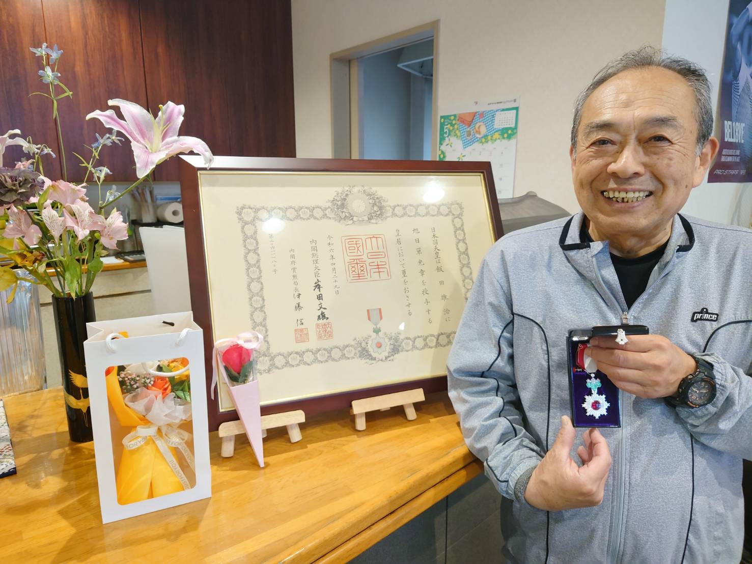 令和6年 春の叙勲 投稿日2024年5月14日2024年5月14日投稿者FukuiTennisClub 旭日単光章 受賞 2024年 春の叙勲にて福井コーチが『旭日単光章』を授与されました。 多くの方の支えにより頂いた章ではないかと思います。 たくさんのお祝いも頂戴いたしました。 この場をお借りして、当クラブからもお礼申し上げます。 クラブ内に飾っておりますので、ご来店の際はぜひご覧ください!